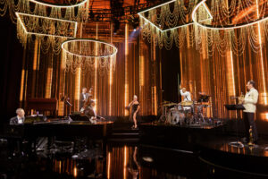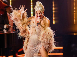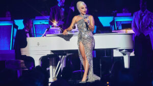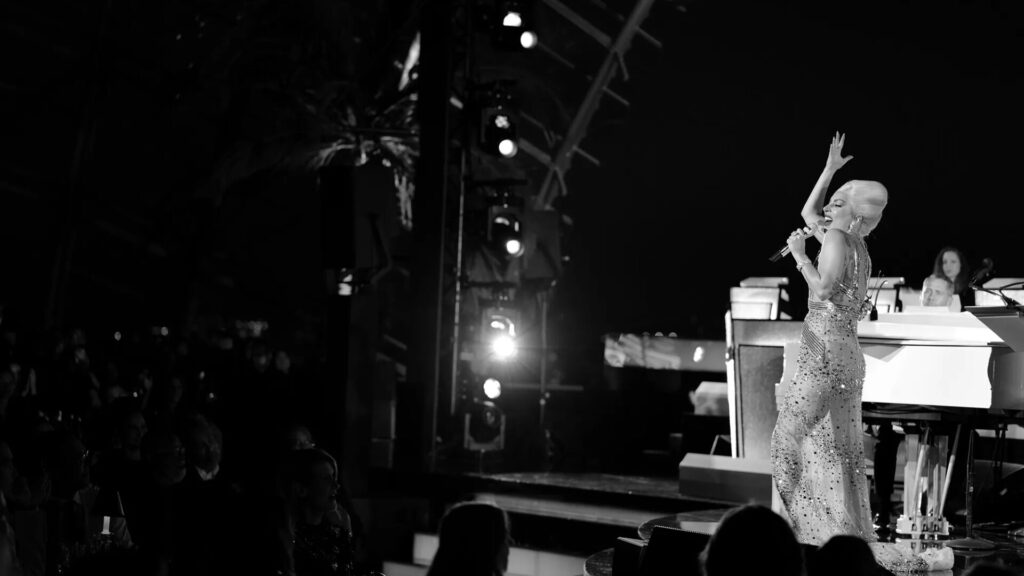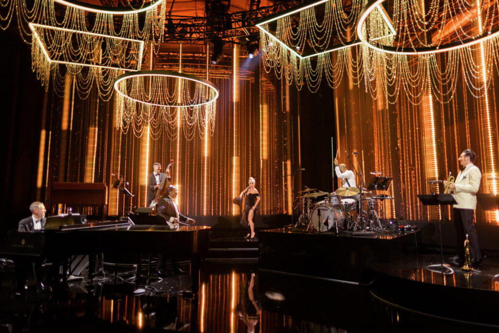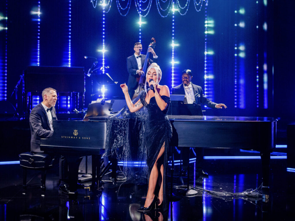 Lady Gaga performed in front of a 5-piece jazz band, wearing a beaded dress designed by her sister Natali Germanotta. The sophisticated set evoked Old Hollywood glamour, matching the medley of tunes she sang, including renditions of Luck Be a Lady and Call me Irresponsible—along with some of her biggest hits, including Poker Face and Born this Way.